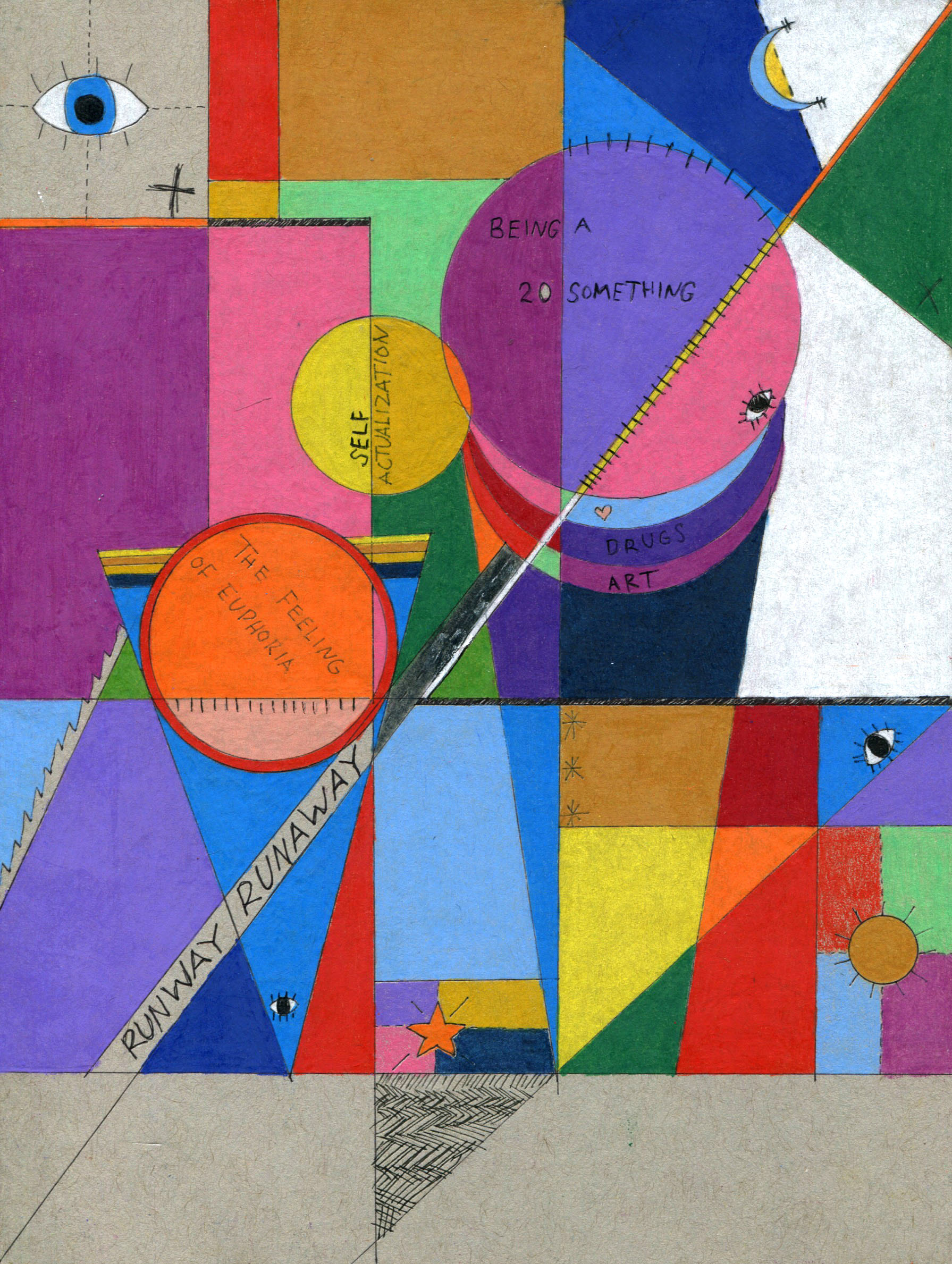 A diagram of being a 20-something in 2019. Colored pencils on chipboard.