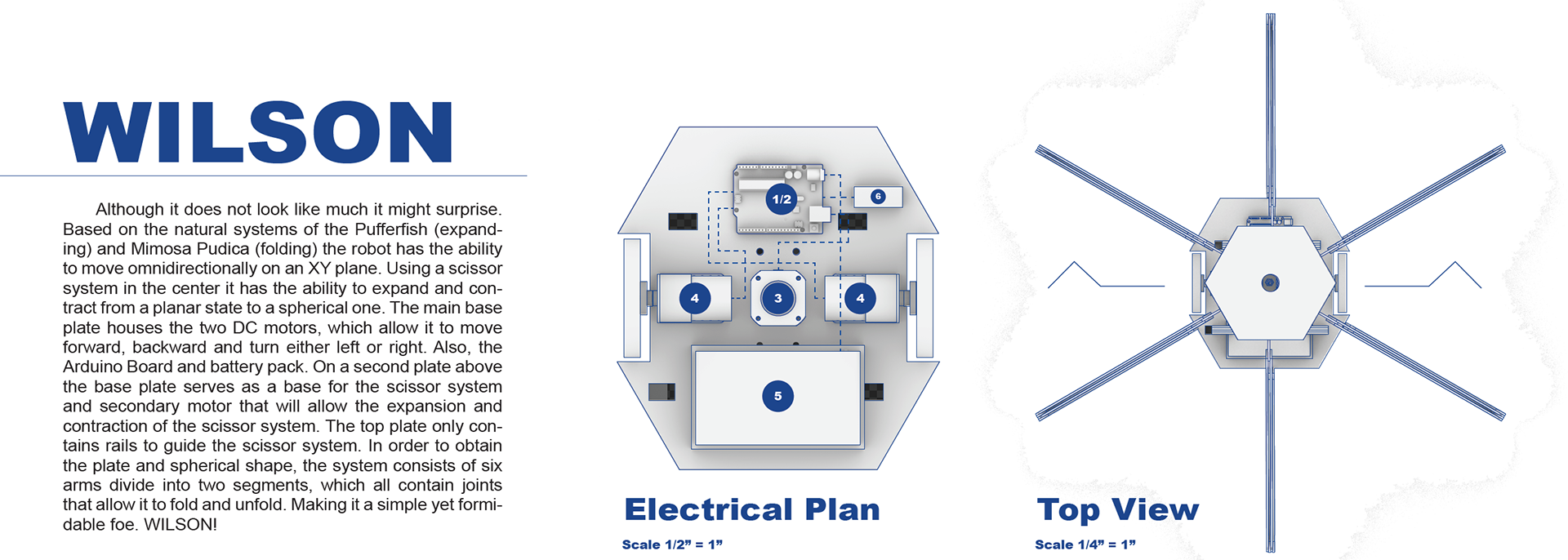 Based on the natural systems of the Pufferfish (expanding) and Mimosa Pudica (folding) the robot hast the ability to move omnidirectional on an xy plane. Using a scissor system in the center and folding arms it has the ability to expand and contract from a planar state to a spherical one. The main base plate houses the two DC motors, which allow it to move forward, backward and turn either left or right. Also, the Arduino Board and battery pack. On a secondary plate above the base plate serves as a base for the scissor system and secondary motor that will allow the expansion and contraction of the scissor system. All while having the rails for the system. The top plate only contains rails to guide scissor system. In order to obtain the plate and spherical shape, the system consists of six arms divide in three segments, which all contain joints in its segments which allow it to fold and unfold.